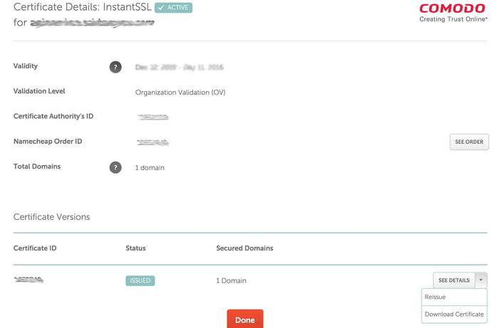 一般没什么大问题的话,审核通过。经过1到3天 comodo会把证书通过邮件发到的管理员邮箱。同时这时NC后台你也会看到你的SSL 证书,你可以通过后台直接下载下来,或者重新签发。如图: